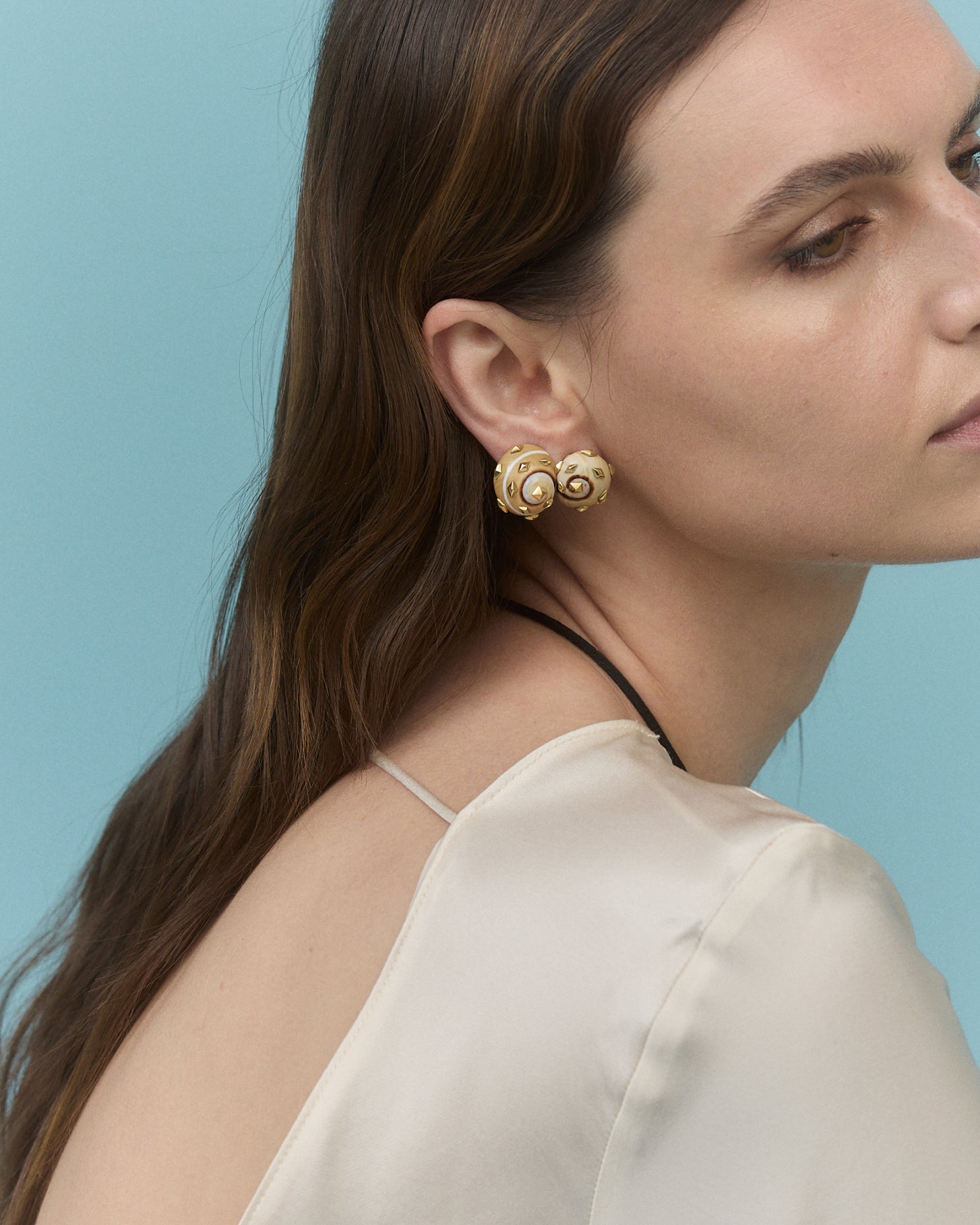 Discover our exclusive Calypso Collection, where exquisite seashells are delicately embedded in crafted gold metal plaquettes and adorned with dazzling gemstones. Each seashell is a natural one-of-a-kind treasure, meticulously selected by Alice Villa, to celebrate the marine treasures' beauty.